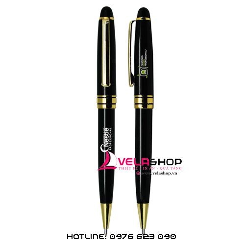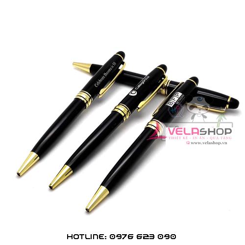 Bút kim loại nắp xoay, cài vàng, mực bút bi, khắc logo, hoặc khắc tên màu vàng, in ấn logo nhiều màu theo yêu cầu